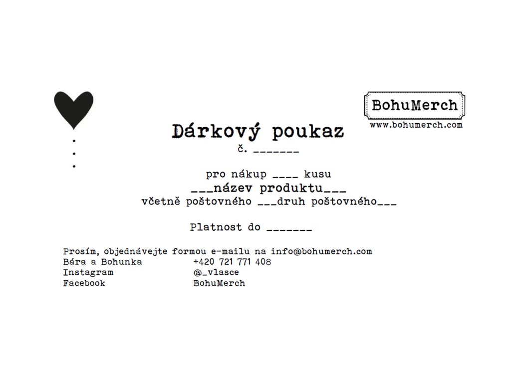 Dárkový poukaz BohuMerch vhodný jako dárek na poslední chvíli. Vložte počet kusů, kolik chcete darovat peněz na certifikát, do poznámky zadejte případné další požadavky (osobní vzkaz, atp.).